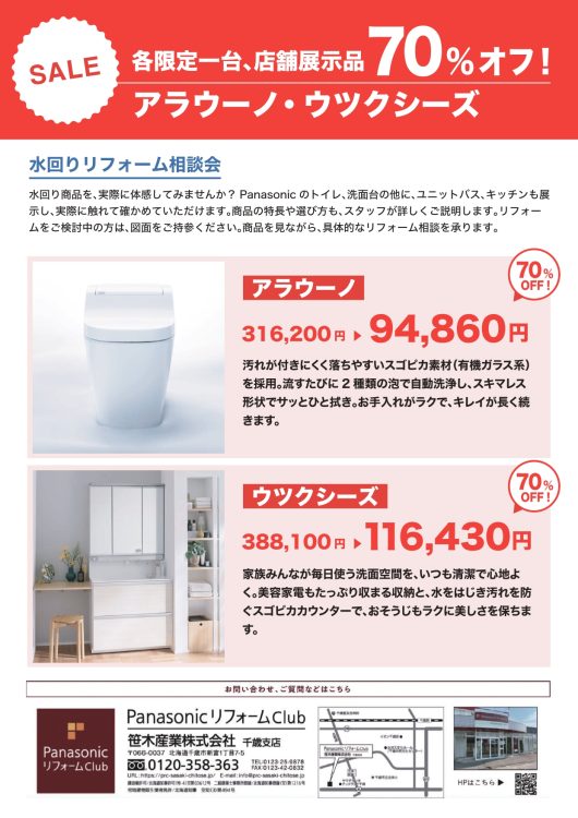展示中の住設機器を、展示現品限り・各1台限定の特別価格でご案内いたします。