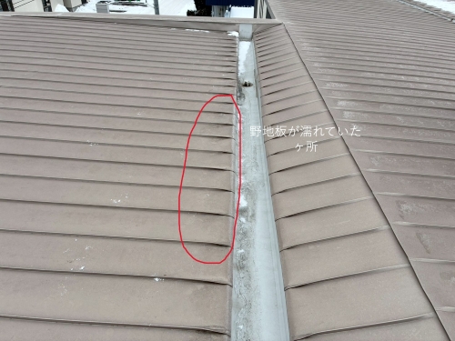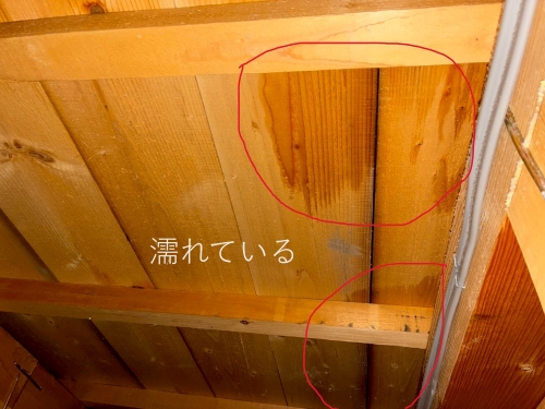 天井裏の野路板が濡れている箇所があり、濡れている箇所の屋根部分が赤囲いしている部分です。